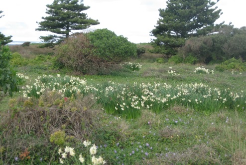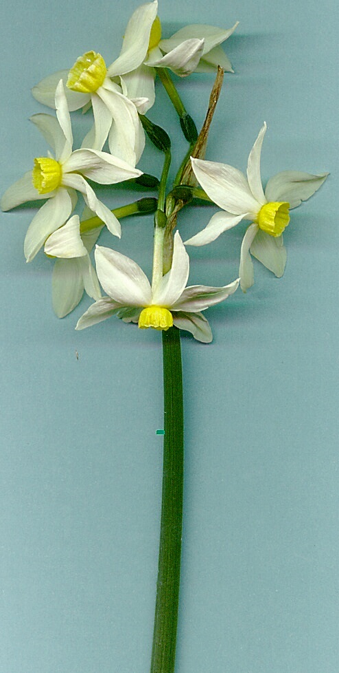 Daffodil (Narcissus pseudonarcissus) is similar. It has larger yellow flowers and the central trumpet is a deeper yellow. There is much variation; there are numerous cultivars and double forms.